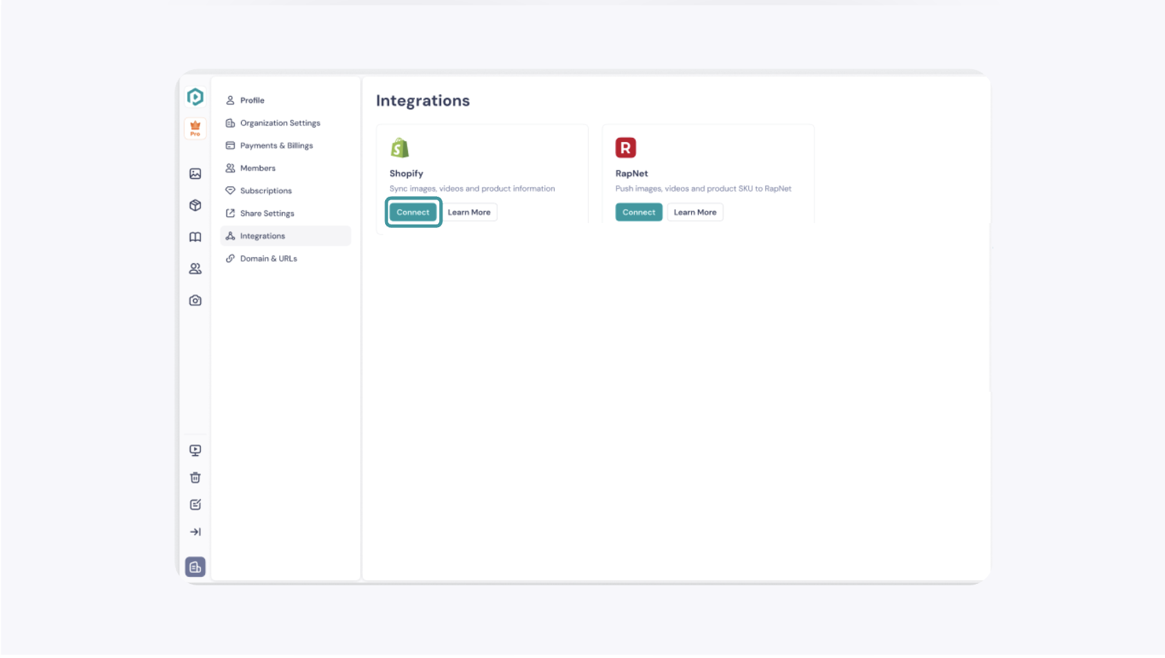 To initiate the GemHub integration with Shopify and commence the synchronization of your products, navigate to the settings page within GemHub and select the integrations tab.