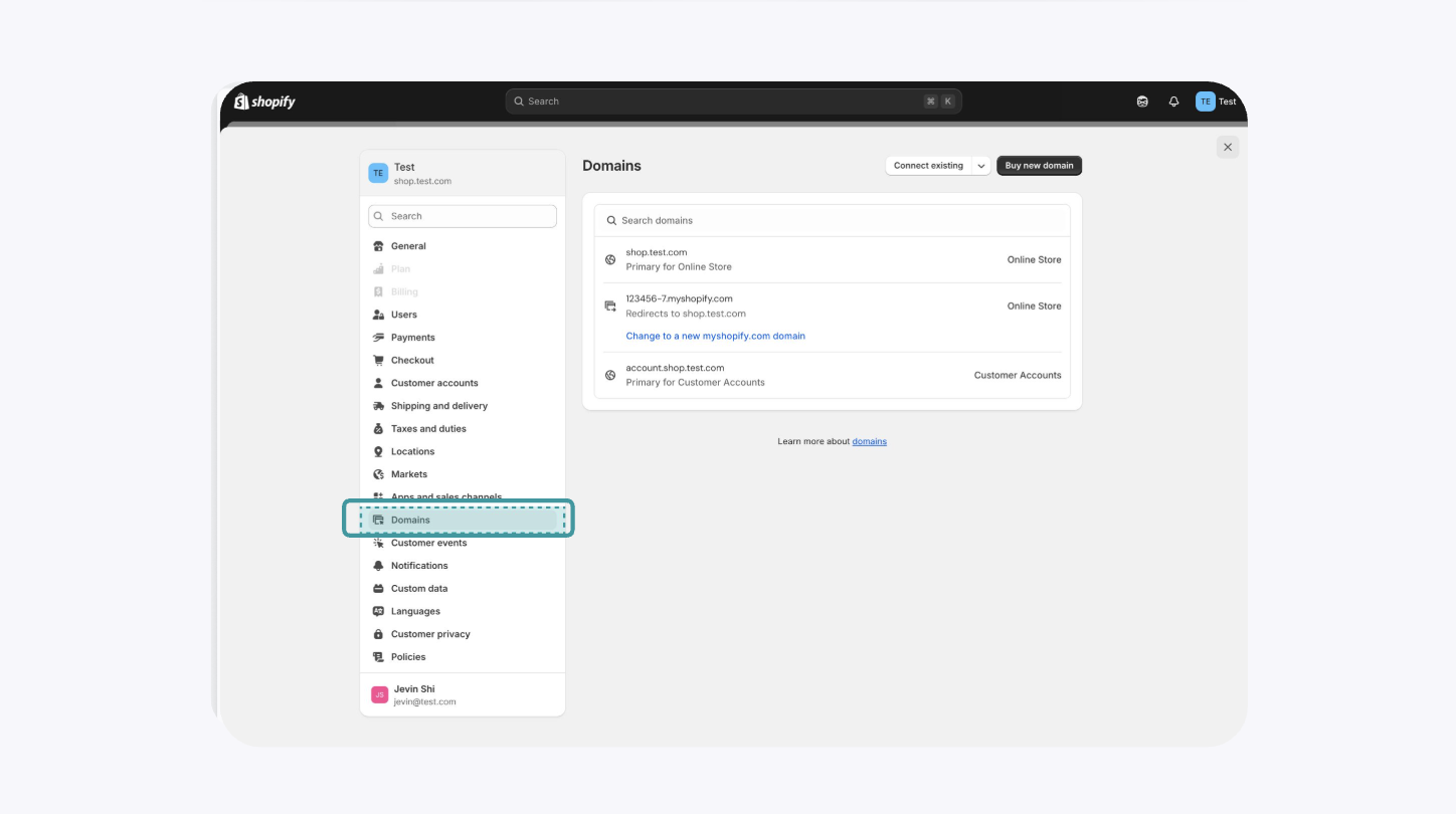 In the left-hand menu of the settings page, click on “Domains.”