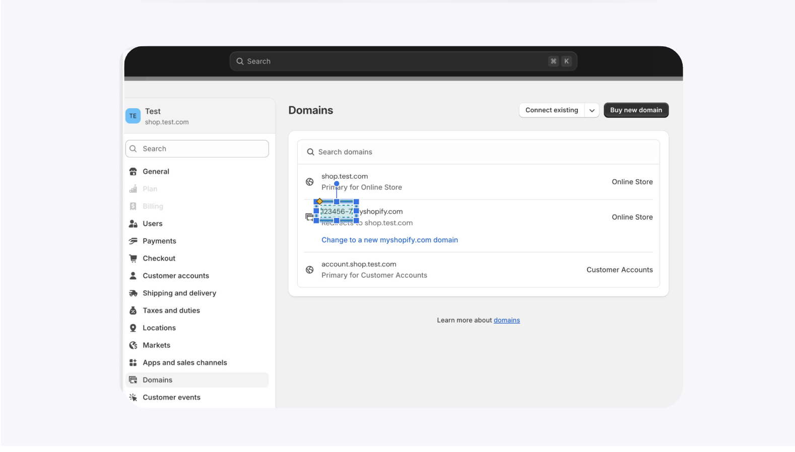 In the domain section, copy the portion that appears before “.myshopify.com”—this is your store URL name. Paste it into the Shopify integration popup in GemHub in step 2.